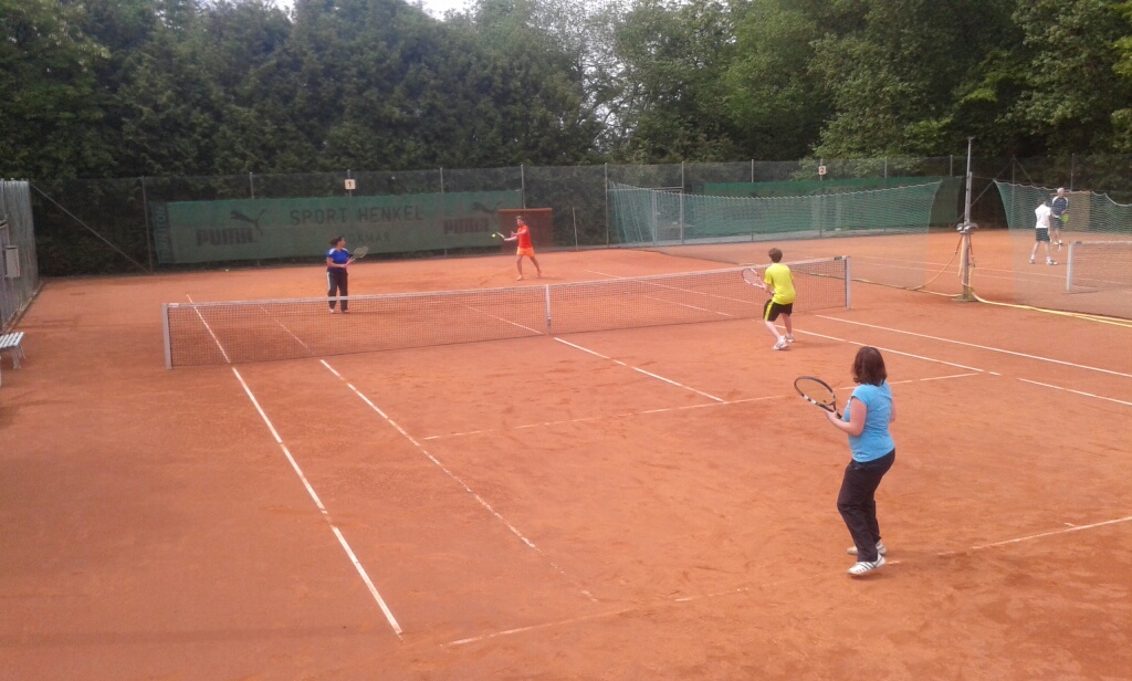 Am heutigen Pfingstmontag trafen sich wieder viele kleine und große Tennisspieler auf der Anlage. Nachdem sich alle beim gemeinsamen Frühstück und einem Glas Sekt gestärkt hatten, wurden die ersten Doppelpaarungen ausgelost und los ging es! Zeitgleich wurden auf Platz 1 und 2 immer zwei Doppel gespielt und nach ca. 20 Minuten das führende Team zum Sieger ernannt. Als „Belohnung“ gab es – natürlich ein Glas Sekt! Anschließend wurden die Teams neu „gemischt“ und weiter ging es im gleichen Modus. Nach drei Wechsel hatten Nadine Neuroth und Andrea Brahm die meisten Punkte (Spiele) für sich gesammelt und waren die Gewinner des heutigen Tages! Erfreulicherweise setzte auch erst nach Abschluss der Doppel der kurze aber kräftige Regenschauer ein.